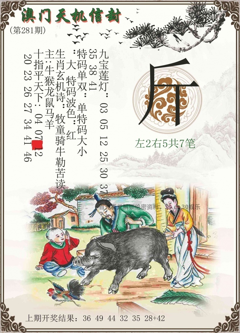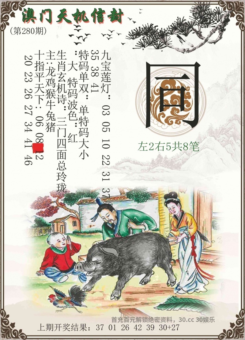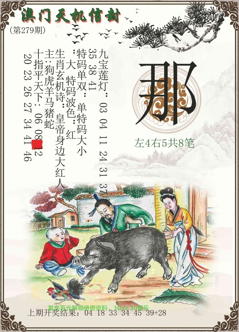 280期芳草玄机:一帆风顺蛇虎午,沾亲带故取蓝红。异想天开七月七,数一数二金肖来。狗拿耗子三更天,龙虎争一伴二七。狗撵兔子势凶残,春秋一轮左右开。 芳草诗:大雁南飞择木栖,先锋已过玉门关。山边树林一行行,迎风遥相望无边。 传奇特肖:虎鼠羊鸡马龙蛇 |