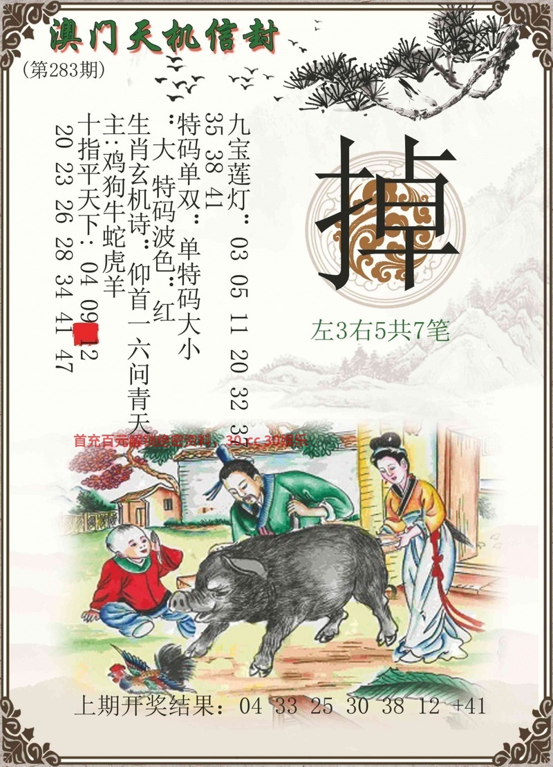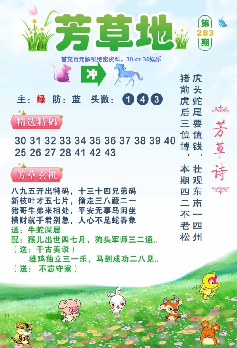 283期芳草玄机:八九五开出特码,十三十四兄弟码。新枝叶才五七片,偷走三八藏二一。猪哥牛弟来相处,平安无事马闲坐。横财就手君别急,人心不足蛇吞象。 芳草诗:虎头蛇尾要值钱,壮观东南一四州。猪前虎后三位博,本期四二不老松。 传奇特肖:狗龙鸡蛇鼠猴牛 内幕头数:143 |